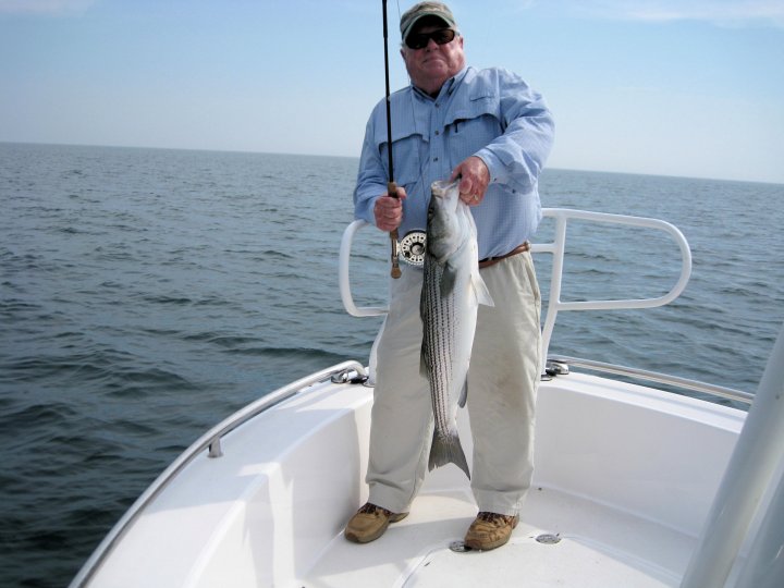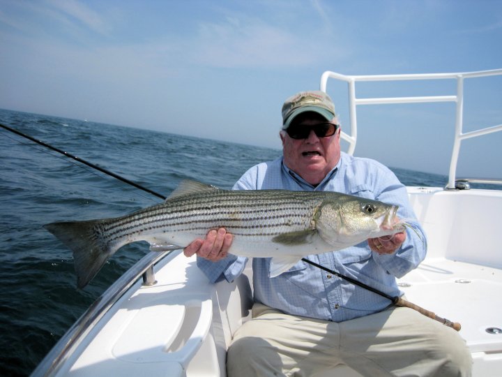 Block Island remains comfortable in the mid-seventies. We’ve completely aborted Narragansett Bay. There are a few stripers around but the success rate is low with plenty of searching, casting, and running around. The bait situation is very poor, oxygen levels low, and water temps high. Out at Block Island the sand eels can be found almost anywhere. Not as dense as previous years where is would fill the screen from top to bottom, there are scattering of bait around. Enough bait to keep small pods of stripers around. Fishing is improving each day. The biggest determent has been heavy fog; nothing seems too materialized near the surface. Captain’s Log We had good friend and striper fanatic Bob Signorella onboard this week. This was one of those trips you look forward to each year and wish for better weather. Bob comes all the way from Pennsylvania just to fish for linesiders every couple of years. We were blanketed by heavy fog all day that never cleared. Most gulls were floating on the calm waters confused too. Cold southerly winds soon make matters worse. We headed back toward the mainland as thunder filled the skies, a disappointed trip to say the least. We finally got a break from fog on Joe Herbert’s Wednesday trip. We found gull activity on sand lances all along the North Rip near sunrise with over a dozen boats already there. Smaller size pods of stripers in the 6-12 lbs. class were slashing bait below the surface. Under these quiet conditions, boat started moving up and down the rip line searching, found that the noise soon killed the bite. We left to get away from the fleet and headed south. It took some time to find to find the bite again. We found stripers on bottom structure in 25 feet of water. The bite lasted for over an hour. We stopped at the North Rip again on the way home to find fish running up and down the bar as the tide was filling in. All toll maybe 15-18 stripers with temps being 75 degrees while the mainland hit the low nineties. Nice and cool and we had a good day.