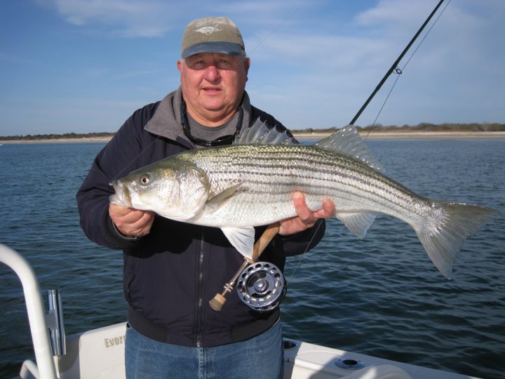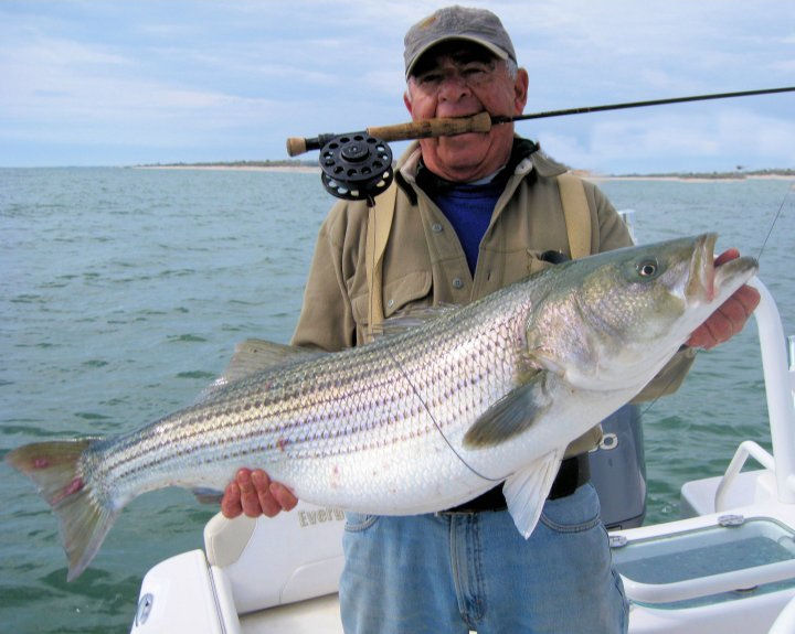 Location: South County, Rhode Island Finally able to get out on the ocean after nearly two weeks of wind and heavy surges. Beautiful fall day, wind down to 5 mph, nice little chop, water temps 59 degrees. Lots of big bait around the ocean shores, pods of adult menhaden mixed with mullet. Find ‘um and there will be some good size stripers below the bait schools with some big bluefish too. It’s tough to figure out where the migration is for this time of the season. Very few boats ventured out the last two weeks. Not much Intel. If today was any indication the big push of big girls is underway and there should be a solid three weeks left of good bass fishing. No signs of any hardtails. Captain’s Log: Quality over quantity, that’s how it played out this morning. Only three stripers boated today but two of them were over 20 lbs. all on flies. Dave Pollack caught a magnificent beast estimated at over 35 lbs. The striper measured in around 42 inches or so. She had such a huge stomach bulge feeding on adult menhaden. Dave enjoyed the 10 minute battle that took him deep into the backing. He did a masterful job getting her to the boat. Dave has been there many times before and has plenty of skill and experience, but to date, this is Dave’s best striper on a fly. He’s not done at 76 year of age. Dave Pollack’s fine catch