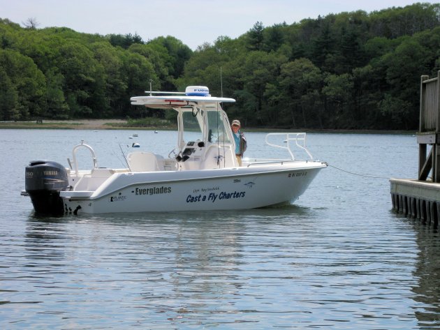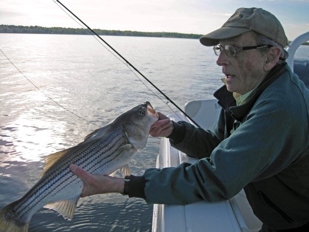 The new Everglades is shipshape, running like a fine watch. We added a new bow rail this year to help stabilized the angler. What a difference it makes when you have a pulpit to grab or lean against the entire day. Several trips already are in the books. Joe Carr from the fly shop of the same name had an extremely pleasant fishing trip with warm weather and flat seas. We scratched around a bit to find some fish. No mother loads, but Joe did have tight lines. Joe Herbert likewise had tougher conditions, higher winds, and poor current flow with a low tide near sunrise. More stripers around each passing day so Joe’s totals were higher. Sorry, no pictures. It seems Joe doesn’t pose for any pictures of stripers less than ten pounds anymore. Joe Carr with an early spring upper bay striper