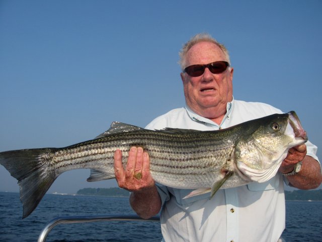 Pods of bunker continue holding north of Providence Point off Prudence Island. They rise and dive quickly. The pogies have gotten educated from weeks of being hunted. The extremely warm temperatures have slowed the bass bite. Still there is good fishing near sunrise. Larger bluefish to eight pounds are around but not in any concentration to produce any surface activity. Look for them down below the bunker line. Rumstick Point has a combination of stripers and bluefish in the mix off the ledges. Captains Log Do you believe in the “Big Bang Theory?” Joe Herbert sure does. But first let me clarify this statement as it may seem ambiguous in this situation. There are those of you who might be thinking how the universe may have been created by one giant super mass exploding in all directions? You would be wrong in this case. Joe, (if you can recall from previous reports) just started saltwater fly fishing a little more than a year ago. At age seventy one, he has decided to soak up as much information and knowledge about the sport as anyone has. That includes some serious On the Water Time too. With Joe there is always a story behind each trip. Naturally today was no different. He arrives with his brand new Loomis Cross-Current rod. Loomis was kind enough to upgrade his previous model with had a broken tip to a much newer one. Boy is he happy! He finds after casting with it for 45 minutes, his new stick has no MoJo whatsoever. Not a hit! Not a bump! He can’t even snag the bottom. Now that’s pretty bad! He switches to his nine weight Sage purchased just two weeks ago. The outfit is over lined with a ten weight full sink line. Talk about Jackal and Hyde! He’s got the timing down pat with this baby. He is soon into stripers. Nice fish, not micros. All average around four pounds. Surprisingly we are catching stripers in 92 degree heat till 11:00 am during the summer. That in itself is surprising in the upper bay. We nail about twenty bass and one eight pound bluefish. Well as you can surmise, he finally gets the Big Bang? That’s the second in two trips. Here are the results of his efforts.