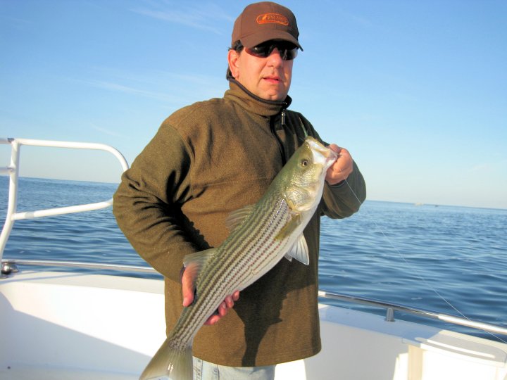 Ken Reall and his son Dave returned to the Ocean State for some fun, relaxation, and a chance to enjoy a fishing trip with an old friend. The Reall’s are native Rhode Islanders, until recently when Ken moved to New Hampshire where Dave has a medical practice. There’s a long history between Kenny and myself that also should be noted. We worked in the same school system for over thirty years together not knowing that each of us share a common passion for the outdoors and fly fishing. Go figure! They both had great day weather wise and the fish seem too cooperated too. Dave caught and released about eight school stripers before the tuna bite began, a nice way to start the morning. We saw bait being harassed on the surface, thought they were bluefish at first, but was not disappointed. Dave was able to make the long cast necessary to keep them within reach. Ken later in the morning would add to his impressive resume by catching his first fly rod albie than add to the total later on in the day. It’s not that easy each day as pressure on the fishery increase. Albie’s become educated rather quickly with boat noise and angler pressure. We had many sightings around the boat near noon. They now know firsthand the frustrations all of us face when suddenly they have lockjaw. Dave Reall holds the first of many stripers and the largest of the morning. When there is plenty of small bait around, don’t expect anything large.