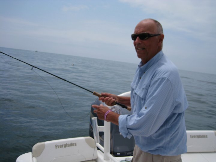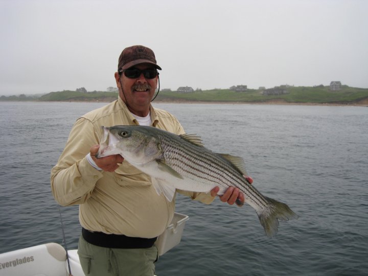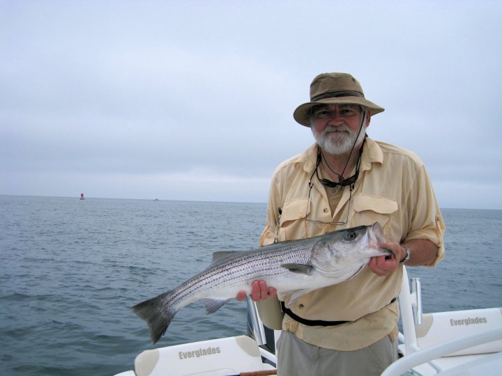 It is easy spotting surface activity (when an occasional striper boils) with the calm seas. Most of them may be spooked by boat noise. The lack of winds makes it perfect situation to fly fish. Lacking is the quantity of sand eels around the shallows. You see spots on the screen but no noticeable densities of bait. The stripers we have landed seem to be along the same contour lines mostly in the twenty foot depths or greater. The lack of bait reduces the loss of bluefish donations. In fact we haven’t landed a single bluefish along the southern side this week except along the mainland. Normally this time of year scup reign supreme taking a fly but with the lack of sand eels we haven’t caught a one either. There are times during the day the saturation in the air moves the fog in rather quickly. The southern side and North Rip are noted for this. Visibility has been good for morning crossings. Captain’s Log: Charlie Fortier and Wayne Perry from the Southeastern Chapter of TU were out with us Friday. It was their first trip out to the Block. It was overcast and calm for most of the day. The bite was slow but evenly space throughout the morning. Normal we try to move around as less as possible not to disturb the situation. We found a few stripers cruising the surface that made the trip manageable. Casting to individual boils is probably the most exciting experience for a fly fisherman. Nothing gets your adrenaline up as fast. Unfortunately it affects your efficiency and nothing seems to go right at the wrong time. Err! Frustration, but that’s life as a fly guy! Charlie with his first BI striper