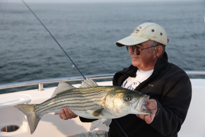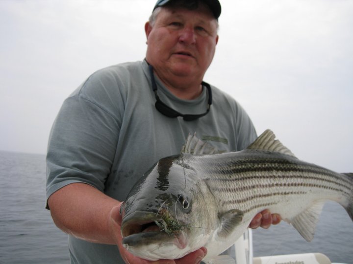 Tuesday was what we call “Legends Day.” If you’re in the fishing industry you meet many fascinating and knowlegble anglers during the winter show months. Very rarely do you ever have the chance to get engaged in any deep conversations so for Cast a Fly, it’s a chance to get to know them on a more personal level. What better playing field than the fishing arena. This year we were very pleased to have Dean Clark on board again after a four year hiatus. Dean brings back so many wonderful family memories that started maybe 15 years ago at the World Fly Fishing Show in Wilmington, MA. My son (eight years old) and I would look forward to his presentations that seemed more informative than frosting. They were keyed to fish content in the pioneer days of early Cape Cod striper flats fishing. There was plenty to learn with this new Southern New England venue. Today Dean is a spokesman, advocate for better management of the striped bass fishery. Much of Dean’s winter hours are spend educating and unifying the ranks thru Stripers Forever, a group that promotes awareness of the species. The West Wall gap was behind us at 4:40 am and visibility was better than a mile heading to the island. It was a quiet run over but we did get the chance to see an ocean tug pushing across the sound. The blanket of fog only made the picture more intriguing. The rip was tame this morning with no indication of life so we just continued on. We found plenty of current movement with hardly a wave. No bird life whatsoever except a few storm petrels flying close to our wake. We managed ten stripers on a fly till noontime with a two man rotation while the third observed. Fishing seemed secondary to storytelling, but I’m sure if the dynamics were different…. than. We caught a lucky break heading back to the mainland around 1:00 pm. We found an acre of feeding, hungry stripers on one inch micro bait. Now it’s time to pad the numbers. We stayed drifting with them for over an hour. The Dennis and Doctor Fran Team soon got our message joined us in on the fun. They had also made the trip to the island and were finishing the day fluke fishing near by. Mr. Pollack with the first bass of the day and the pool winner